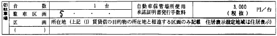 駐車場(保管場所の位置)に関しての記載があります。「区画」欄を見てみると、「上記(1)賃貸借の目的物の所在地と相違する区画のみ記載」とあります。言い換えると、この欄の上部に記載されている建物の所在地と異なる場合にのみ、駐車場(保管場所の位置)の所在地に関する具体的記載があるということになります。したがって、この場合は、駐車場(保管場所の位置)の所在地は建物の所在地と同じということになります。