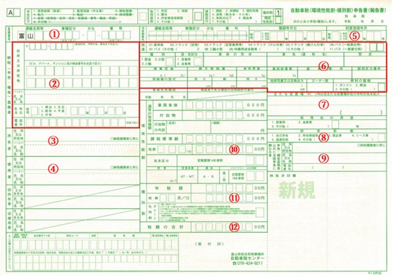 - 富山県の場合、税申告書の様式は「新規・管轄入」用と「県内移転・変更」用の2タイプがありますが、基本的には、実際の手続きとは違う側の様式を使用しても受理してもらえます。(2021年6月に当事務所が手続きを行った案件において、手続き前の時点において富山ナンバーの自動車での手続きでしたので本来「県内移転・変更」用を使用すべきところで「新規・管轄入」用を使用いたしましたが、そのまま受理されました。)